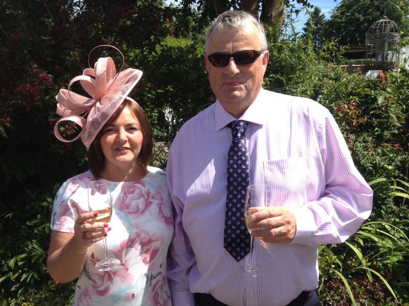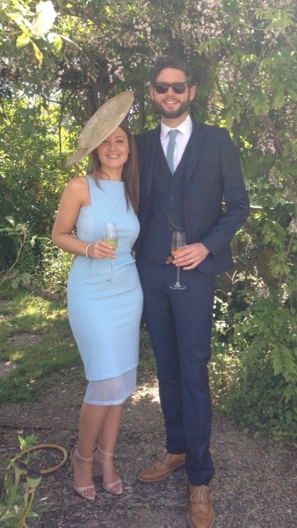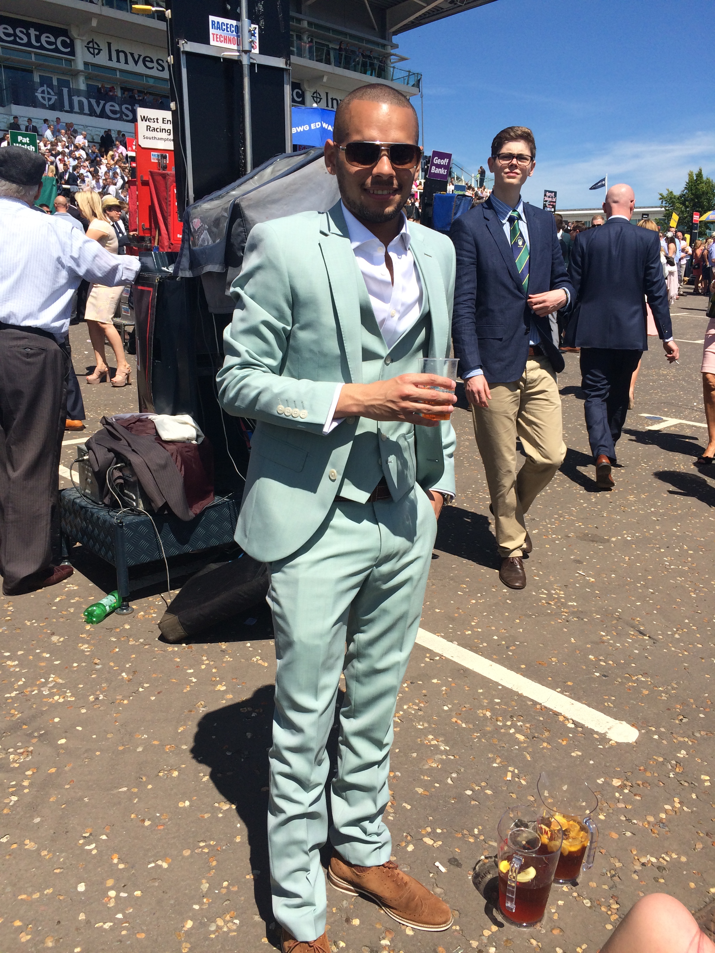 I opted for a fitted pale blue ASOS number with mesh detail on the sides and bottom and teamed it with a nude/lace mix hatinater (half hat/half fascinator!) from House of Fraser. My old faithful favourite shoes from Zara finished off the look. A little boxed handbag that I picked up in Primark added a bit of pop to my outfit and having a strap was a god-send – juggling drinks, money, betting slips and a clutch would’ve ended in tears, I’m sure. The boy wore a classic navy three-piece with tan brogues and a very summery aqua tie and socks. He does love a bit of colour coord!